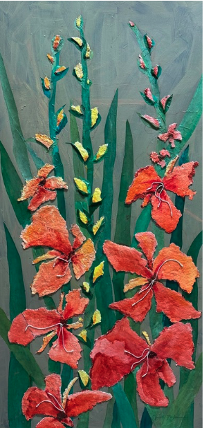 Award-winning Atlanta-based artist Kathy Rennell Forbes is repurposing art to create Unexpected Beauty in her nature-themed solo show May 5 - June 12. As shown in Glorious Gladiolas (left), Forbes reveals her newest obsession in creating vibrant, joyful art from unwanted or unfinished pieces otherwise left to wither. She uses mixed media watercolors on repurposed, hand-made watercolor paper adhered to canvases and panels. Forbes is offering a workshop, Creating Unexpected Beauty, May 5 - 7 in conjunction with her art opening.